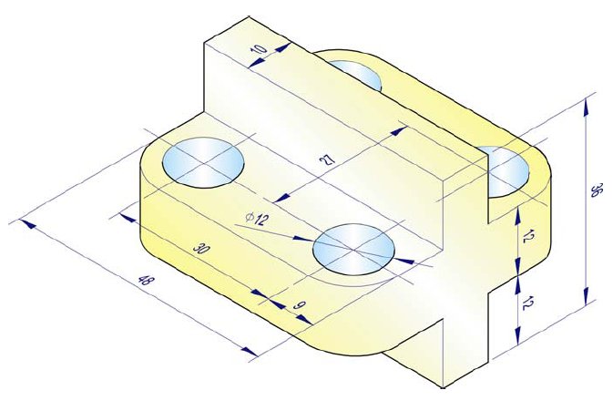 (c)1.選擇矩形塊的四個角上作圓角特徵(半徑為9mm),2.作孔(直徑皆為12mm)特徵: 選擇水平面,選擇與該孔同心的圓角,(範圍:全部),套用。(只有最後一次才用確定結束圓角指令)