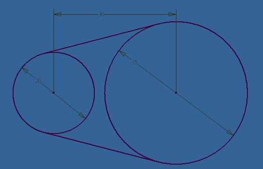 - 畫兩條直線其兩端分別與兩個圓相切。完成草圖