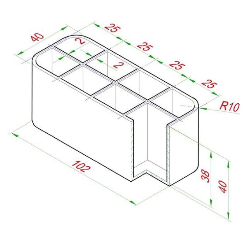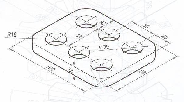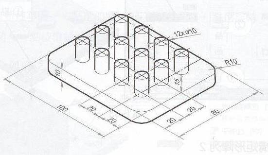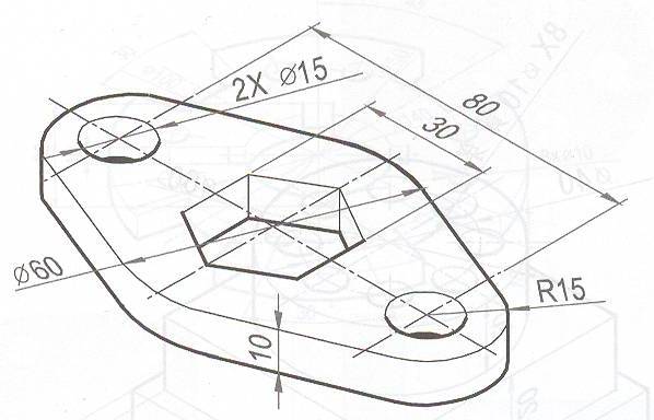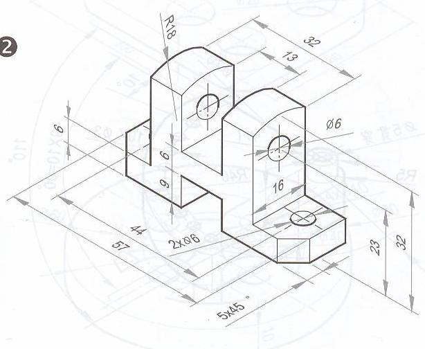 說明:在圖面上至少需有:1. 等角視圖,2.三視圖, 3.標註尺寸, 4.有孔的零件需加繪剖面視圖,5.有斜面的零件需加繪輔助視圖, 6.標題欄內需註明:圖名,班級,姓名,學號,比例 。
