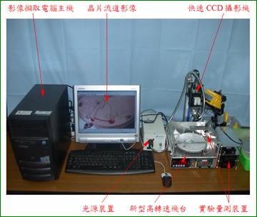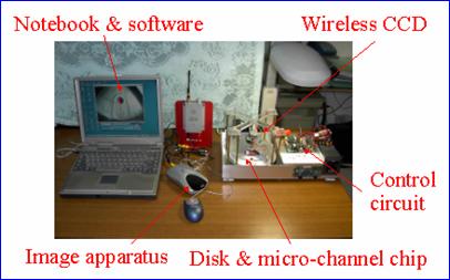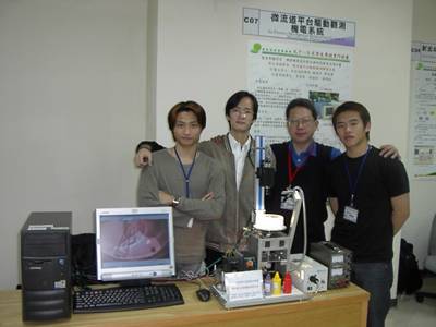 「微流道平台驅動觀測機電系統」是將一片表面蝕刻有不同微流道的矽晶片或壓克力片置於一可調速之旋轉平台上,藉由平台旋轉的離心力,使原先置放於碟片較中心位置之液體(或塑料)往外沿微流道射出;再透過裝置於旋轉平台上方的CCD攝影機,即可觀測流體在微流道中的流動狀況,作為進一步研究的參考。