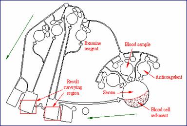 2.發明新型生物晶片—突破國外只考慮徑向流動,自創加入旋向的「離心式微流體平面驅動法」,初步實驗顯示此連結混合器、分離器與創新的分配器而成的新型晶片可順利作用,一次搞定原本需多次多量操作的實驗室生醫檢驗工作。