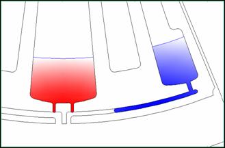 透過小氣囊的活塞裝置,離心力可驅動待反應氣體與微流道的液體作用或再驅動液體流向反離心力的方向,重新被分配利用。